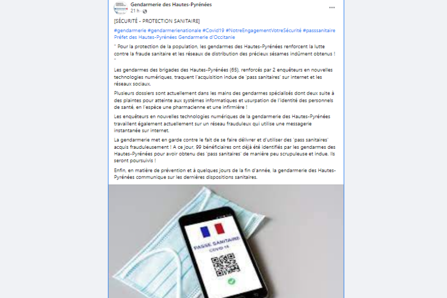 La gendarmerie des Hautes-Pyrénées renforce la lutte contre la fraude sanitaire, de plus en plus courante dans le département avec 99 faux pass relevés pour l'instant. Plusieurs plaintes ont déjà été déposées pour atteinte aux systèmes informatiques et usurpation de l'identité de personnels de santé. La gendarmerie traque la pratique frauduleuse sur internet et les réseaux de distribution et met en garde la population. Toute tentative ou pratique frauduleuse sera poursuivie. N.B....