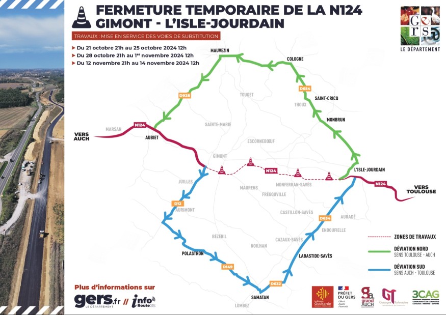 Dans le cadre des travaux de mise en 2x2 voies de la N124 entre Gimont et L’Isle-Jourdain, le tronçon fermé à la circulation depuis ce lundi 21 octobre 21 heures a rouvert à 14h ce vendredi 25 octobre 2024.