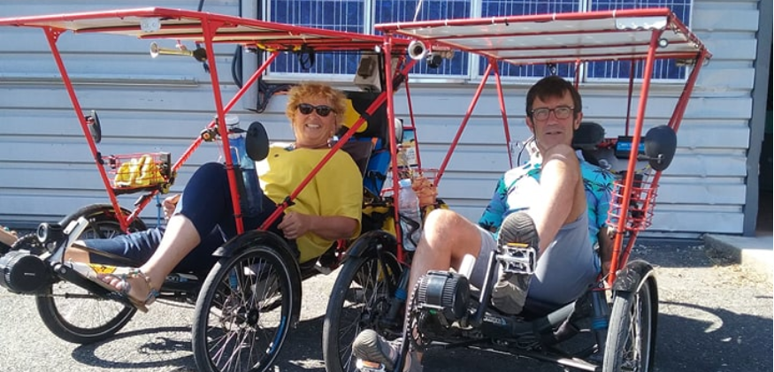 Pour parcourir le pays, le couple avance à l'aide de tricycles semi-couchés à assistance électrique (conçus par des amis du couple) comme l'explique Laurence Bonnemayre :
