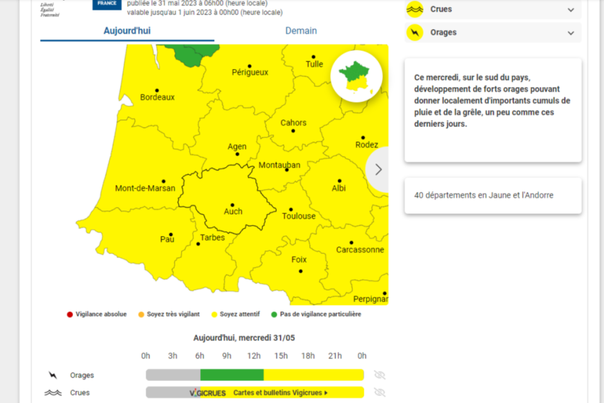 Un nouvel épisode orageux est annoncé ce mercredi après-midi dans le sud ouest. Le Lot-et-Garonne et le Tarn-et-Garonne sont placés en vigilance jaune par Météo France pour des risques d'orages. De même pour le Gers et les Hautes-Pyrénées, également en alerte pour des risques de crues. Ces dernières concernent les tronçons de l’Adour amont - Echez et de l’Arros - Bouès. Les averses orageuses de l'après-midi pourraient provoquer des débordements en soirée. Selon Vigicrues, le niveau de l'Adour amont reste haut, sous l'effet des précipitations des derniers......