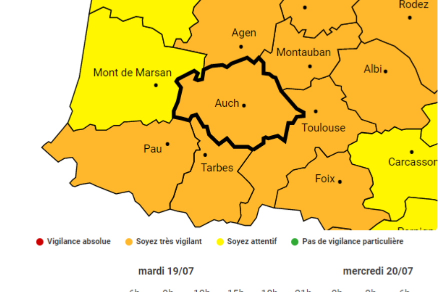 Un épisode caniculaire nécessitant une attention particulière en raison de son intensité et de sa durée, avec un pic de chaleur extrême sur la façade ouest est en cours. Cet épisode nécessite le placement de 15 départements en vigilance rouge canicule dont le Gers, le Lot et Garonne et les Landes. Situation actuelle Le temps est calme et chaud sur le pays. À 15 heures, on observait 36 à 39 degrés dans le Sud-Ouest, et même 40.8 degrés à Belis dans les landes (40), 34 à 37 degrés dans le Sud-Est et 30 à 35 degrés de la Bretagne vers les......