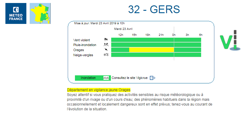 Météo France a aussi placé le Gers en vigilance jaune pour les orages. Pour le département, les specialistes lancent l'alerte à partir de 14 heures et jusqu’à 3 heures du matin, dans la nuit de mardi à mercredi. Redoublez de vigilance, notamment sur les routes.