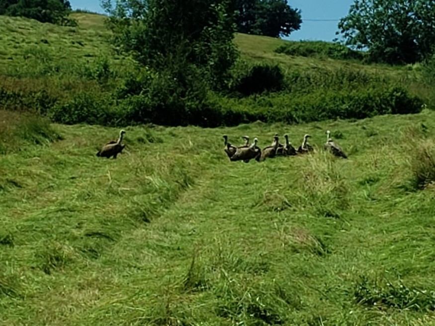 "Dimanche, j’étais en train de faucher pour faire du foin, quand j’ai malheureusement heurté un petit chevreuil. Très vite, des buses sont arrivées pour se nourrir de la carcasse. Puis, tout à coup, elles se sont envolées, et j’ai aperçu un grand oiseau : un vautour. J’en avais déjà vu en montagne, mais jamais ici. D’autres l’ont rejoint rapidement, j’en ai compté treize au total. Ils sont restés environ dix minutes, le temps de dévorer le faon. Ensuite, ils ont disparu. Mardi matin, mon voisin est allé voir ses vaches, comme chaque jour. L’une d’elles venait de mettre bas, le veau était vivant. Quelques heures plus tard, en repassant, il a découvert sept à huit vautours sur le veau, en train de le dévorer. L’animal n’avait sans doute pas encore réussi à se lever. Couché au sol, il a été pris pour une proie et ils l'ont dévoré."