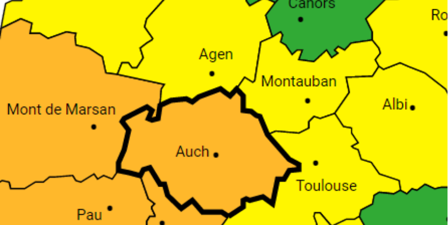 Le département du Gers est actuellement en vigilance orange en raison d'un risque crues, et actuellement en vigilance jaune en raison d'un risque vent violent. Aujourd'hui on observait à 06h un vent de secteur Ouest Nord-Ouest soufflant jusqu'à 65 km/h, un cumul de précipitations en 12 heures de 15 mm à 20 mm. Des averses sont prévues toute la journée avec un cumul maximum de pluie attendu dans les pays de Gimone et Savès de 10 millimètres. Le vent sera assez fort, d'Ouest à Nord-Ouest avec des rafales atteignant 65 km/h en journée. Pour la nuit prochaine, des précipitations sont attendues mais moins continues, sous forme d'averses. Progressivement, elles seront de moins en moins nombreuses, mais elles restent tout de même possibles jusqu'en fin de nuit. On prévoit au maximum jusqu'à 10 millimètres de pluie sur le bas Armagnac ainsi que sur l'Astarac. Pour demain samedi, le ciel restera gris, avec des pluies éparses. Aucune amélioration n'est attendue.