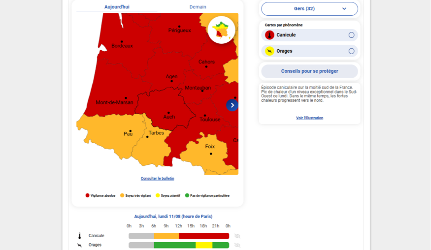 Des températures extrêmes autour des 40 degrés, avec des pointes jusqu'à 43 degrés. Ce sont les valeurs annoncées pour ce lundi dans le département du Gers et dans une grande partie du sud ouest. Un épisode de canicule d'une « intensité exceptionnelle », selon le Conseil départemental qui invite chacun à la vigilance et à la solidarité.