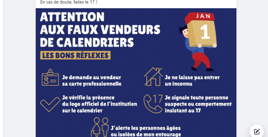 La gendarmerie de Lot-et-Garonne a mis en garde depuis la semaine dernière contre les fausses ventes de calendriers. Un phénomène récurrent chaque année qui vise principalement les personnes âgées et vulnérables. Régulièrement, les arnaqueurs sont vêtus ou se comportent à la manière de professionnels pour inspirer confiance et détourner l'attention. Ils en profitent souvent pour voler porte-monnaie, bijoux et objets de valeur. La vente de calendriers est réservée aux pompiers et aux facteurs. Pour éviter ces arnaques, il est possible et conseillé de demander une carte professionnelle aux personnes qui proposent de vendre des calendriers.