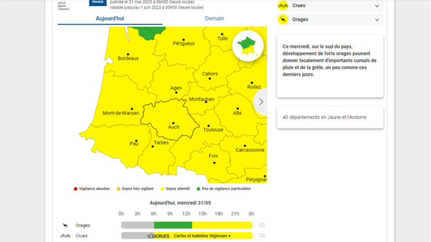 Un nouvel épisode orageux est annoncé ce mercredi après-midi dans le sud ouest. Le Lot-et-Garonne et le Tarn-et-Garonne sont placés en vigilance jaune par Météo France pour des risques d'orages. De même pour le Gers et les Hautes-Pyrénées, également en alerte pour des risques de crues. Ces dernières concernent les tronçons de l’Adour amont - Echez et de l’Arros - Bouès. Les averses orageuses de l'après-midi pourraient provoquer des débordements en soirée. Selon Vigicrues, le niveau de l'Adour amont reste haut, sous l'effet des précipitations des derniers jours.